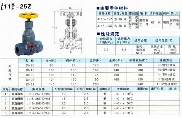 J11B内螺氨用截止阀简称(氨阀)经常要用到氧气、氮气、氢气、氩气等气体。这些气体一般都是贮存在专用的高压气体中。使用时通过氨用截止阀使气体压力降至实验所需范围,再经过其它控制阀门细调,使气体输入使用系统。最常用的减压阀为氨用截止阀,简称氨用阀。