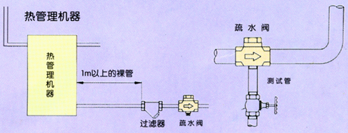 1. 安装方向,请把主体侧面铭牌上铭记的箭头所指方向和凝结水流向保持一致。 2.如果疏水阀能够感受到热管理机器等设施的放出热量时,请用裸管隔开1米以上。 3. 请不要为疏水阀保温。 4. 请避免在疏水阀入口侧安装如电磁阀那样紧急开关功能。 5. 在动作确认、运行停止时,排出残留空气,凝结水时,可以在疏水阀下部Rc1/2插头部分安装测试阀、加以利用。 6. 在寒冷的地区,担心发生冻结时,请在配管时注意不要让凝结水滞留。 7. 万一、疏水阀的温差电偶破损时,阀门关闭。 |