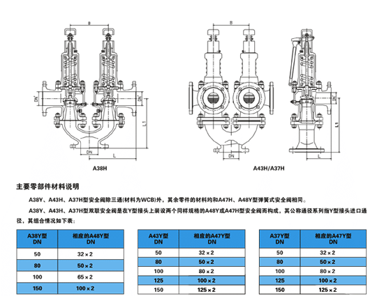 A38Y双联安全阀、A37H双联安全阀、A43H双联安全阀、此安全阀是在一个Y型接头上装两个同样型号规格的安全阀,其公称通径是指Y型接头进口通径。该安全阀适用于工作温度≤350℃的蒸汽、空气等介质的设备或管道上,当设备或管道内压力超过允许值时,安全阀自动开启,继而全量排放,当压力降至规定值时,安全阀自动关闭,保证设备安全运行。